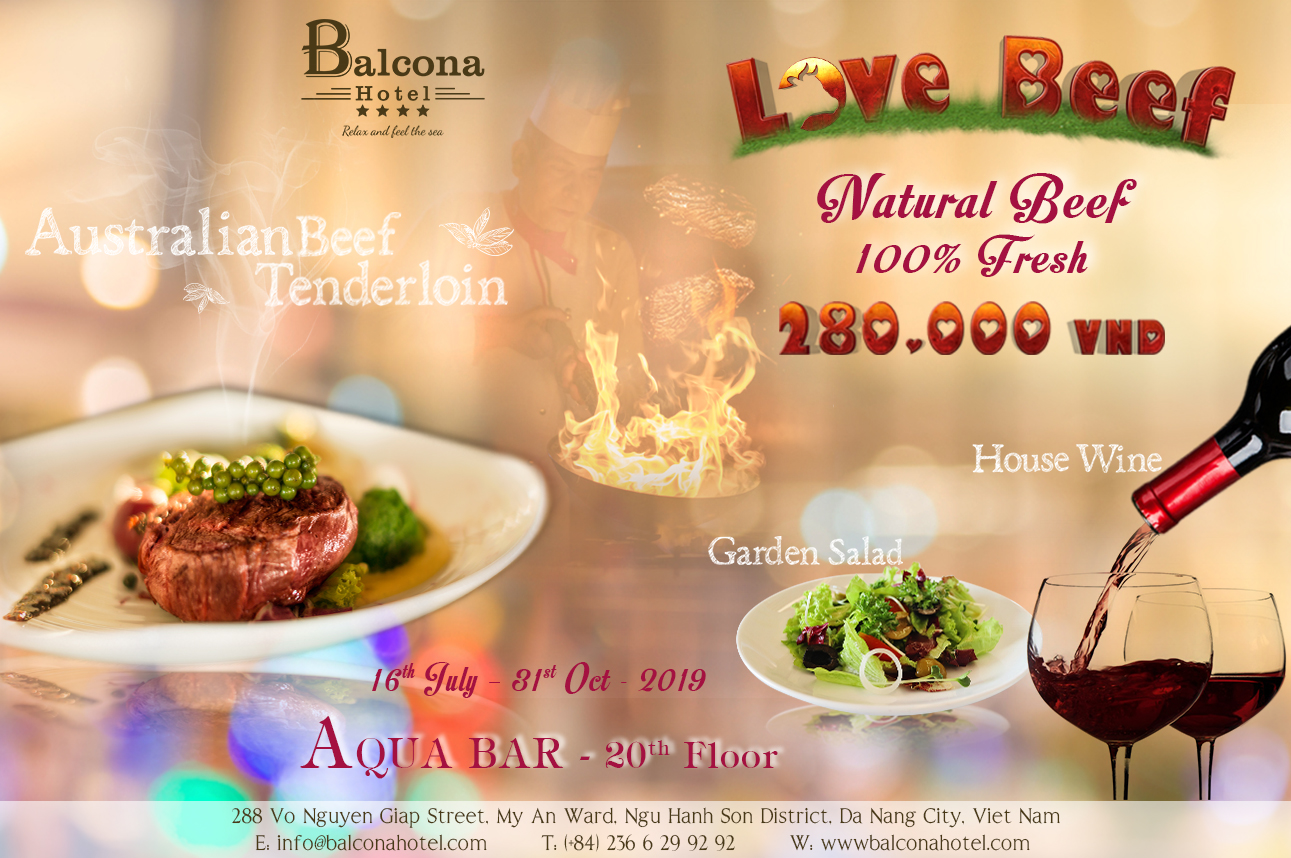 ?? Enjoy the classy flavors of each dish with quality beef at Aqua Bar – the 20th floor of Balcona Hotel Da Nang. In addition, guest will also receive a special offer with 1 glass of Luccarelli wine and fresh vegetable salad for the meal.