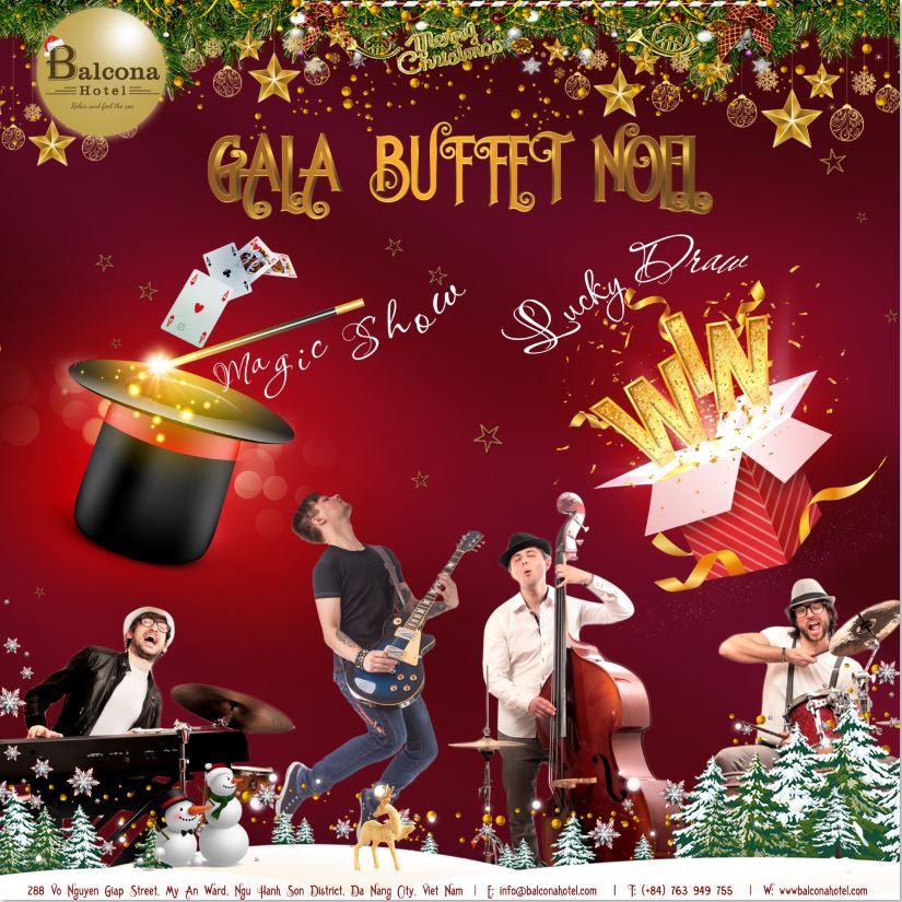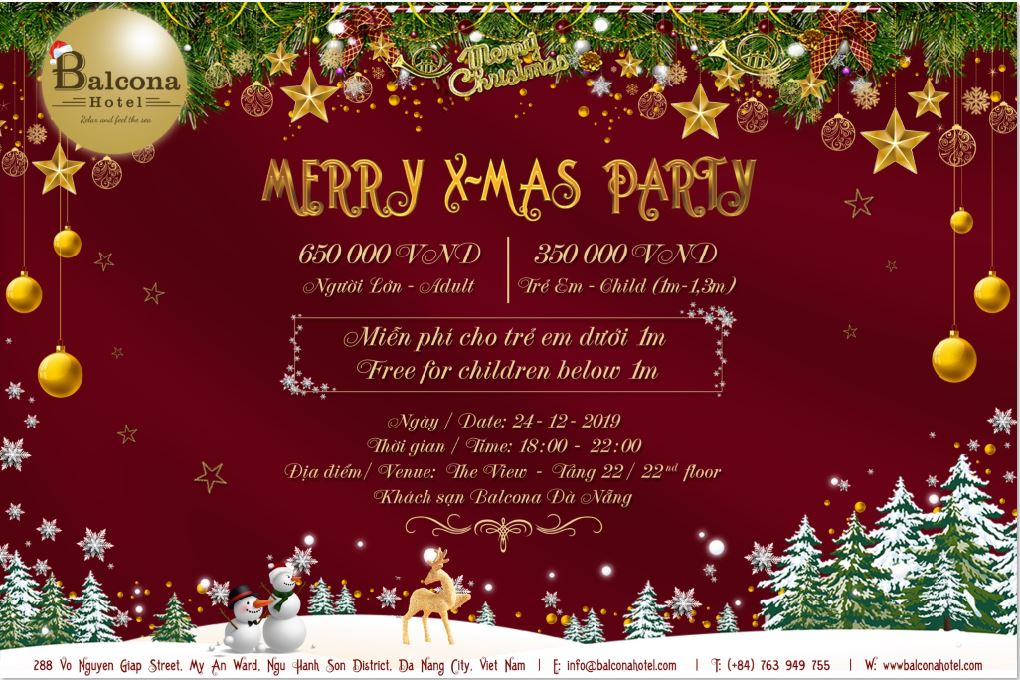 Dịp Giáng Sinh này, hãy cùng Balcona Hotel Đà Nẵng mang đến những phút giây thư giãn ấm cúng và vui vẻ cùng bạn và người thân với chương trình: Giáng sinh – Đêm đoàn viên. Với những ca khúc rộn ràng và những màn ảo thuật kỳ thú, hãy cùng nhau tạo nên thật nhiều những kỉ niệm đẹp đẽ cùng những niềm vui bất ngờ để đêm Giáng Sinh 2019 được trọn vẹn.